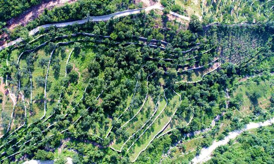 “窖西花谷”的梯田从村南向北顺大山谷两旁弯弯曲曲盘绕着直至山顶。过小桥爬上人行步道,彩色梯田依山就势层层叠叠,形态各异、高低错落、大小不一、气势恢宏,令人心旷神怡。