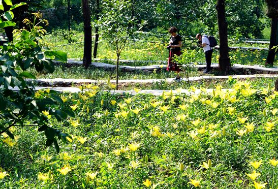 “中国历史名乡”南窖乡,果林茂盛,风景秀丽,南窖乡党委自关闭煤矿后在产业转型过程中,加强农业观光旅游建设,在区农委和区种植业服务中心指导下,因地制宜打造的“窖西花谷”大西沟村梯田百合盛开,岭谷迷人,特别是6月底7月初,五彩缤纷的百合花多彩多姿,在梯田、沟峪两旁的柿子、核桃、杏、栗子、花椒、香椿树下开得眼花缭乱,如今虽盛花期已过,但是在伏天酷暑那迷人的黄百合花仍把梯田装饰的黄烁烁金灿灿,真是翠绿的青山变成了金山。